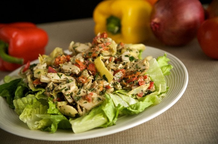 Sliced tender grilled chicken breast with sun-dried tomatoes, artichoke hearts, red onion & red bell pepper served on a bed of fresh lettuce.